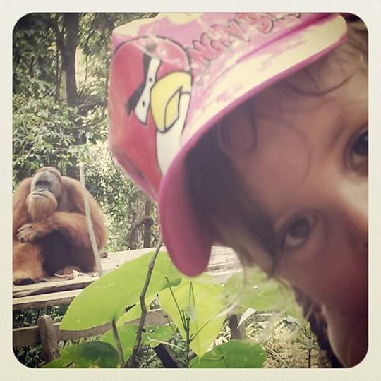 Drei anlauefe haben wir tatsächlich gebraucht um sie zu sehen. Morgens um 8.30 und um 14.30 sind die Zeiten an denen man zur feeding plattform kann.zwei Tage lang haben wir es morgens versucht und keiner der orang Urans liess sich blicken….. Der weg ist relativ beschwerlich wenn man mit einem 11 kg orang bepackt 20 min.den Dschungel hochlaeuft bzw. Klettert und das auch noch bei den Temperaturen…aber man kann es ja auch als Sport sehen Yara war beim zweiten mal total enttäuscht und fragte wann die orange denn endlich kommeb würden. Am nächsten Tag gingen wir dann nachmittags. Wir sassen vor der Plattform und hörten auf einmal hinter uns Äste knacken und da kamen sie aus dem Dschungel.eine mama mit baby und ein grosses Männchen.