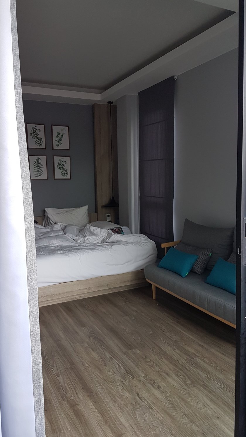 1 grosses Doppezimmer, mit kleiner Küche und Terasse. 1 grosses Doppelbett und eine kleine Couch (in der Yara oder Ilyas schlafen) wir könnten aber auch alle zusammen in dem Bett schlafen 😉 Bad mit Dusche